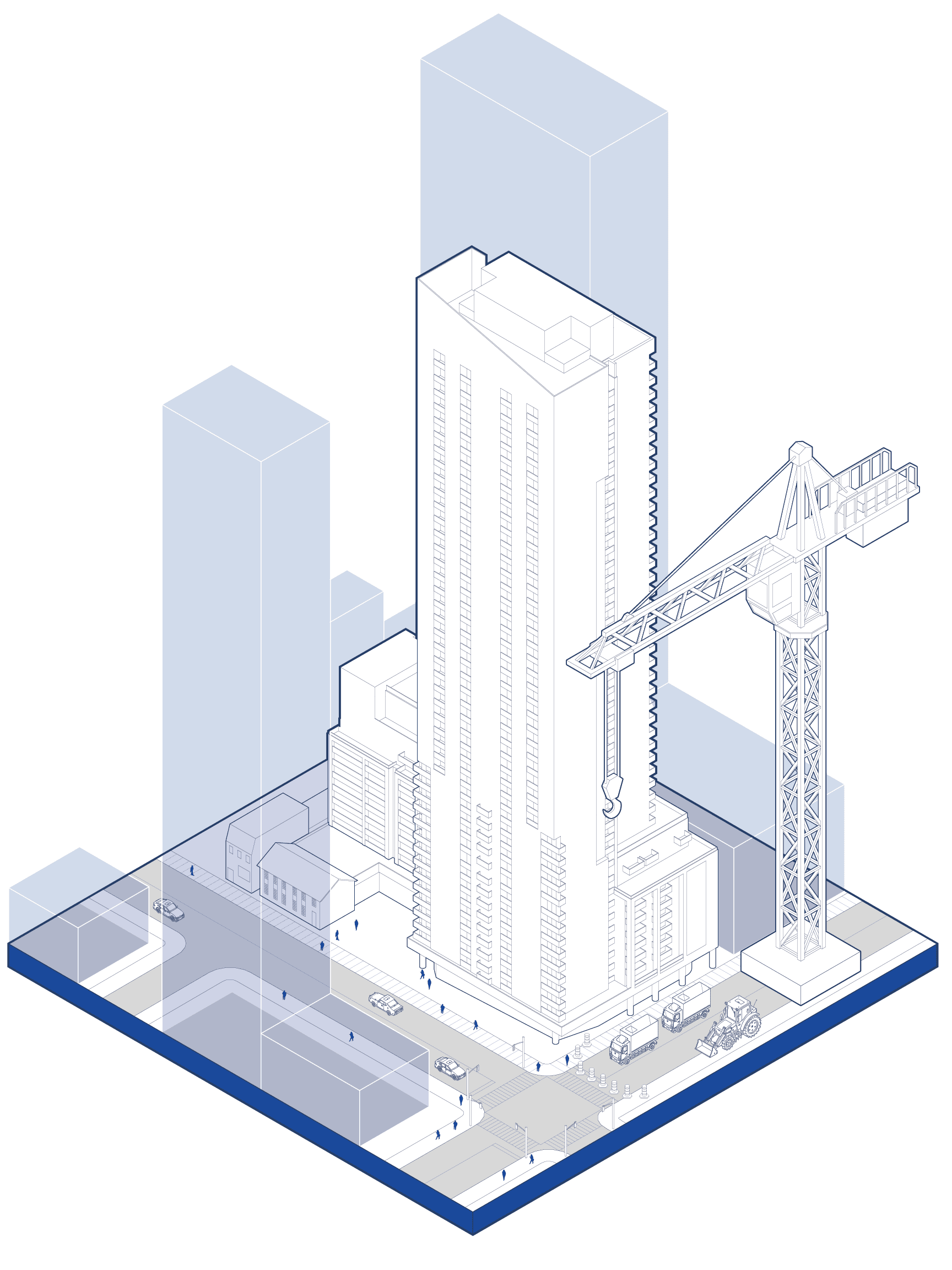 Mast climbers are scaffolding systems set up along the height on your building and tied into its face for structural support. These require that space at the base of your building be allocated as a construction zone. For most renovation scenarios that involve the removal of your existing façade and application of a new one, a mast climber is a must.