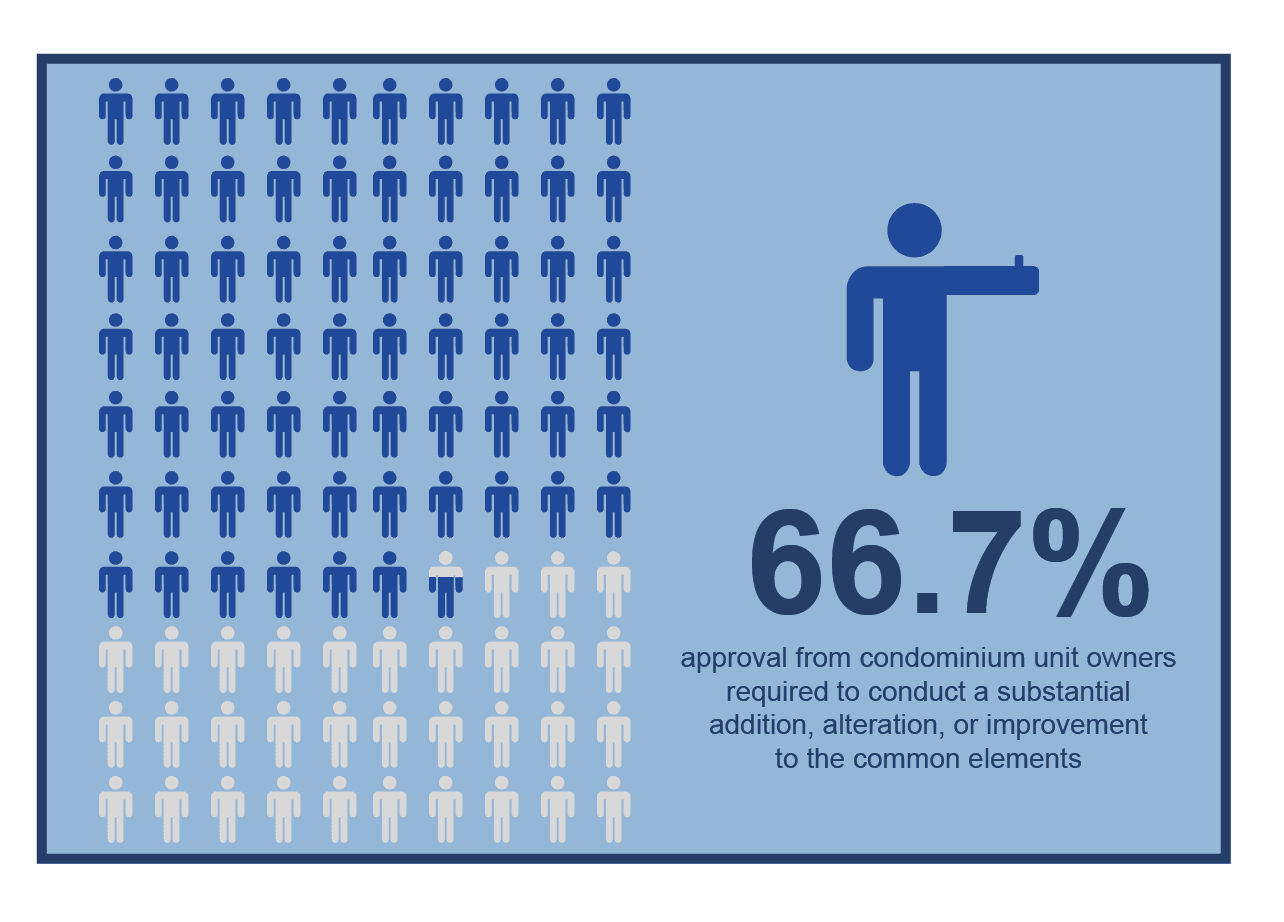 97 (4) Despite subsection (3), the corporation shall not make a substantial addition, alteration, improvement to the common elements, a substantial change in the assets of the corporation or a substantial change in a service that the corporation provides to the owners unless the owners who own at least 66 2/3 per cent of the units of the corporation vote in favour of approving it. 1998, c. 19, s. 97 (4).