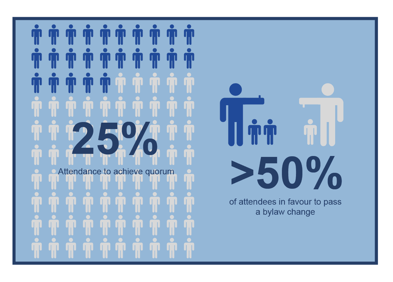 If quorum is not met by the second consecutive attempt to conduct business at a board meeting, quorum can be achieved with 15% of the owners of the units in the corporation for the third or later attempt. Once quorum is met, any attempt to adjust the by-laws of your condominium required 50% approval from those owners in attendance.
